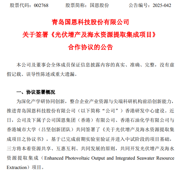 10月15日,青岛国恩科技股份有限公司(下称“国恩股份”)发布公告称,公司及下属子公司与香港城市大学(吕坚创新团队)签署合作协议,共同开发光伏增产及海水资源提取集成项目。